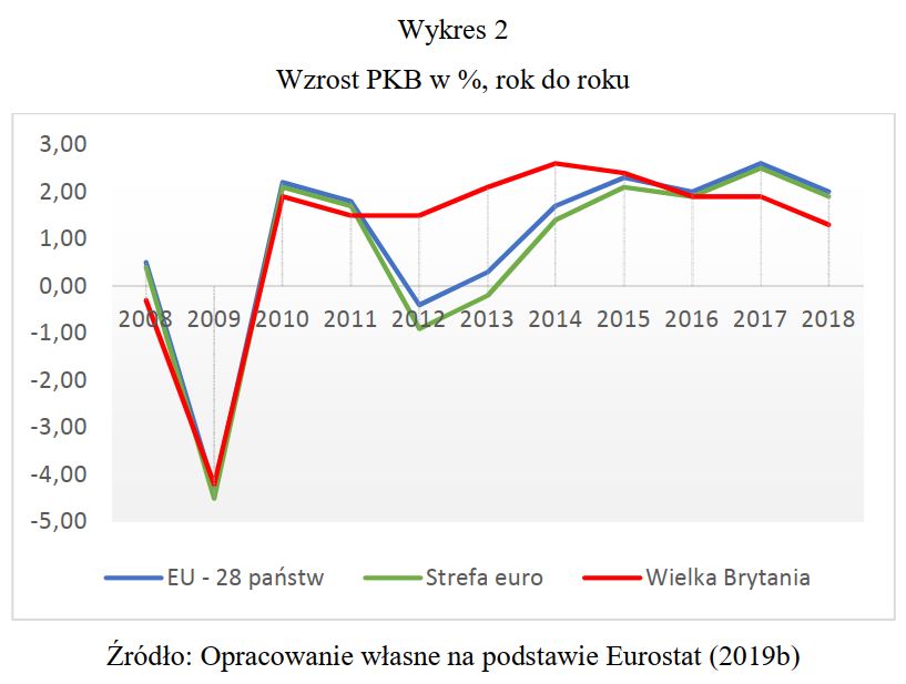 Analiza wykresu wskazuje wyraźnie, iż na przestrzeni ostatnich 10 lat brytyjski ustandaryzowany wskaźnik produktu krajowego brutto liczonego przy pomocy standardu siły nabywczej zbliża się do wartości średniego wskaźnika dla wszystkich państw UE, zaś w ostatnich latach był na minimalnie niższym poziomie niż adekwatny wskaźnik dla państw strefy euro. Oznacza to, iż bogatsza dotąd Wielka Brytania zaczyna być doganiania w tym aspekcie przez średnią unijną, nawet mimo przyjęcia do UE 1 stycznia 2009 roku względnie niezamożnych Bułgarii i Rumunii. W roku 2016 została zaś już doścignięta i przegoniona przez kraje strefy euro. Czy oznacza to, że Wielka Brytania znajdowała się w stagnacji gospodarczej podczas gdy państwa Unii przeżywały okres przyśpieszonego rozwoju? Na to pytanie pozwoli odpowiedzieć kolejny wykres przedstawiający wzrost produktu krajowego brutto w porównaniu rok do roku.