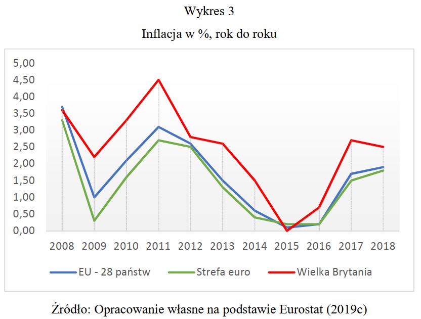W przypadku tego wykresu łatwo zauważyć, iż kryzys finansowy z lat 2007-2009 w podobnym stopniu dotknął zarówno gospodarkę Wielkiej Brytanii jak i pozostałych państw Unii Europejskiej. Pokryzysowe tempo wzrostu gospodarczego było zaś dużo wyższe niż średni wskaźnik liczony dla pozostałych państw Unii. Punkt styczności tempa rozwoju gospodarczego zaistniał dopiero w latach 2015 i 2016 (moment zapoczątkowania procesu Brexitu) i od tego czasu, być może w związku z wynikami referendum i związaną z tym niepewnością co do przyszłości Wielkiej Brytanii, brytyjskie tempo rozwoju gospodarczego było niższe niż w państwach unijnych, choć należy podkreślić, iż różnica nie była znaczna. Być może pytanie o wskaźnik wzrostu cen dóbr i usług pozwoli wyjaśnić konwergencję wskaźników produktu krajowego brutto w standardzie siły nabywczej Wielkiej Brytanii oraz państw UE.