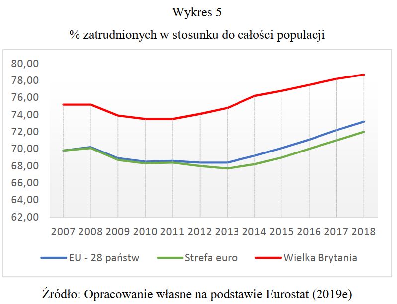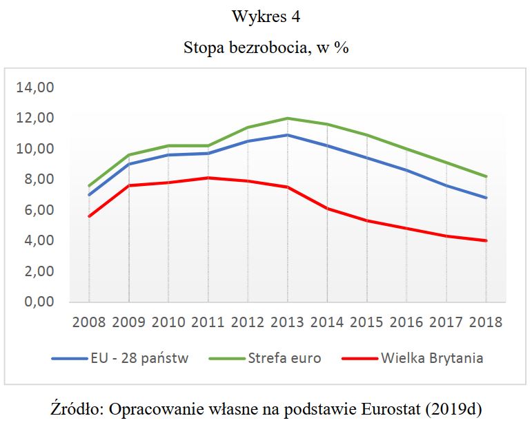 Średnia stopa bezrobocia państw członkowskich UE oscylowała w dekadzie 2008-2017 na poziomie 7% – 11%, w strefie euro był to zaś poziom niewiele wyższy. Z drugiej strony stopa bezrobocia w Wielkiej Brytanii była wówczas znacznie niższa niż w pozostałych państwach strefy jednolitego rynku europejskiego – w roku 2018 wynosiła blisko 4%. Podobnie prezentują się zaprezentowane poniżej statystyki dotyczące zatrudnienia.