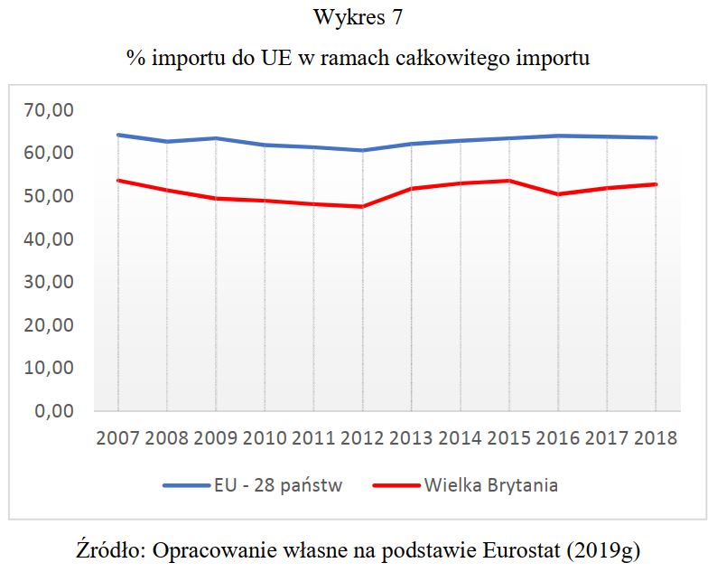 Prowadzona przez Wielką Brytanię wymiana handlowa jest w mniejszym stopniu powiązana z państwami Unii Europejskiej niż średnia wartość wymiany innych państw Wspólnoty. Przez cały analizowany okres zarówno import dóbr i usług od państw unijnych jak i eksport do nich dóbr i usług jest średnio o 10 punktów procentowych niższy niż średnia państw unijnych. Oznacza to, iż związki Wielkiej Brytanii z członkami Unii są mniejsze niż innych państw Wspólnoty pomiędzy sobą, co stawiałoby Zjednoczone Królestwo niejako na peryferiach europejskiego systemu-świata. Dopiero analiza geograficzna (peryferyjne, wyspiarskie położenie Wielkiej Brytanii względem kontynentu europejskiego oraz historyczne związki z byłymi koloniami) pomóc może w wyjaśnieniu niższej niż w przypadku innych państw unijnych wartości relacji handlowych Wielkiej Brytanii z krajami UE.