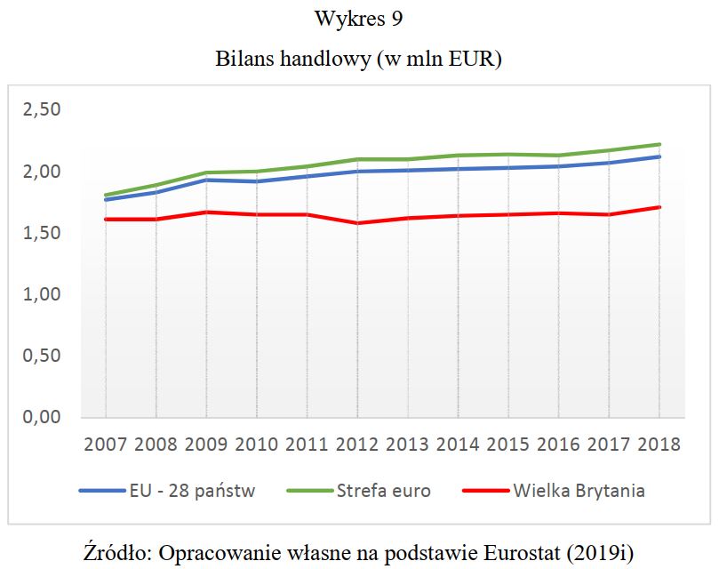 Bilans handlowy analizowanego okresu prezentuje się dla Wielkiej Brytanii niekorzystnie – w każdym roku z analizowanych wartość importu dóbr i usług była wyższa niż eksportu. Co więcej, z powyższego wykresu wynika że rynek Wielkiej Brytanii może być wręcz traktowany jako rynek zbytu dla towarów wyprodukowanych i usług świadczonych przez przedsiębiorstwa z innych państw unijnych – lokalne maksimum państw Unii plasuje się w momencie, w którym Wielka Brytania znajduje się w punkcie minimum. Te bardzo niekorzystne z punktu widzenia brytyjskiej gospodarki dane mogą wskazywać, iż narasta z roku na rok niekorzystny dla kraju bilans handlowy. Dokonując pewnych uproszczeń można stwierdzić, iż import towarów jest o wiele mniej korzystny z punktu widzenia gospodarki narodowej niż eksport – import powoduje bowiem stratę kapitału, który jest przecież najważniejszym osiągnięciem w gospodarce rynkowej i celem działalności przedsiębiorstw. Ponadto import towarów może doprowadzić pośrednio do bezrobocia poprzez zmniejszone przychody firm i w efekcie malejące zatrudnienie. Z punktu widzenia bilansu handlowego można zatem dokonać ostrożnego przypisania Wielkiej Brytanii do państw z wolną utratą wytworzonego kapitału.